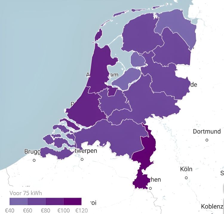 Verder blijkt uit de analyse dat de locatie waar je parkeert invloed heeft op de prijs: in een parkeergarage betaal je gemiddeld 8,5 procent meer voor stroom dan langs de openbare weg. Ondergrondse garages zijn het duurst, met gemiddeld 17 procent hogere tarieven. Op de kaart hieronder kun je de gemiddelde prijs per provincie voor een volle 75 kWh-batterij zien.