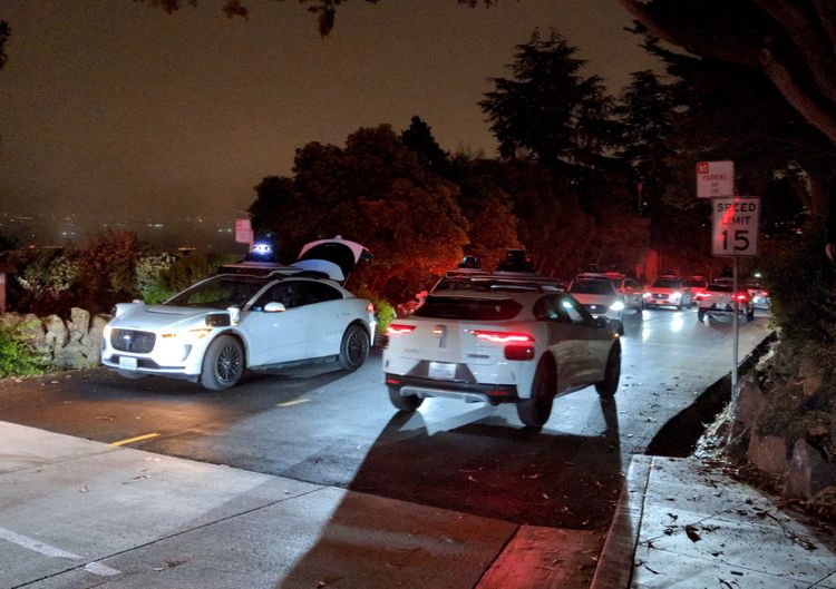 Binnen enkele minuten rolden tientallen witte Jaguar I-Paces met draaiende LiDAR-torens de heuvel op. Ze stonden bumper-aan-bumper, blokkeerden het smalle straatje en ontnamen andere weggebruikers iedere kans op doorrijden. De auto’s wachtten ongeveer tien minuten op hun niet-bestaande passagiers en vertrokken daarna automatisch. Iedere rit resulteerde in een no-show-boete van omgerekend 4,33 euro. Waymo schakelde daarop tijdelijk alle ritten binnen twee huizenblokken uit, tot de volgende ochtend.