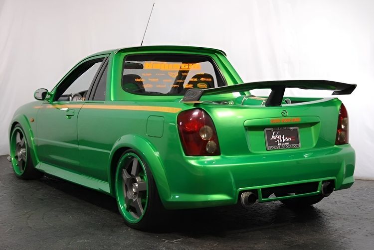 Het eerste wat opvalt aan de foto’s is het nieuwe uiterlijk van de Mazda. De pick-up kreeg namelijk een gifgroene kleur, een bodykit van DG Motorsports, een picknicktafel van een spoiler, twee knoeperds van uitlaten en 19-inch lichtmetalen wielen. Daarnaast is er nog steeds verlichting voor onder de auto, maar die werkt helaas niet meer.